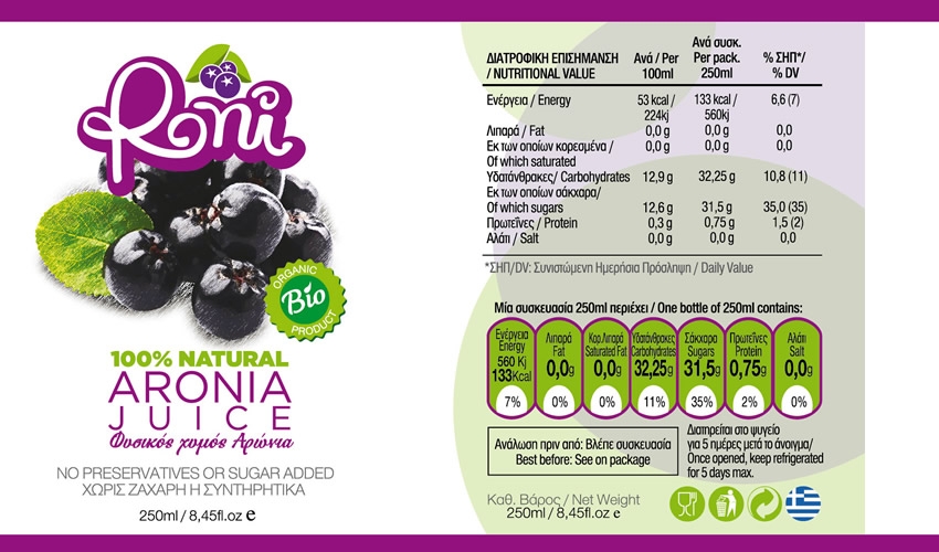 Ο χυμός της Αρώνιας παράγεται από φρέσκα φρούτα, παστεριώνεται για να συγκρατήσει και να διατηρήσει την πλούσια ποικιλία των βιολογικά ενεργών ουσιών, το φρέσκο άρωμα και την χαρακτηριστική ήπια γεύση της Αρώνιας.