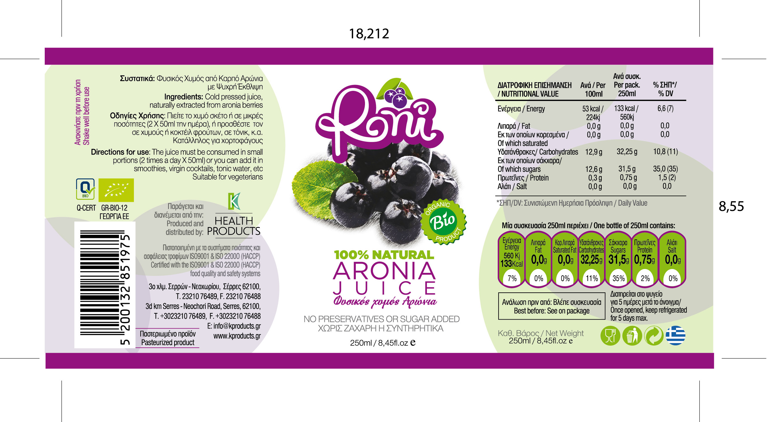 100% Βιολογικός χυμός αρώνια σε συσκευασία γυάλινη 250ml ανά 12άδα.